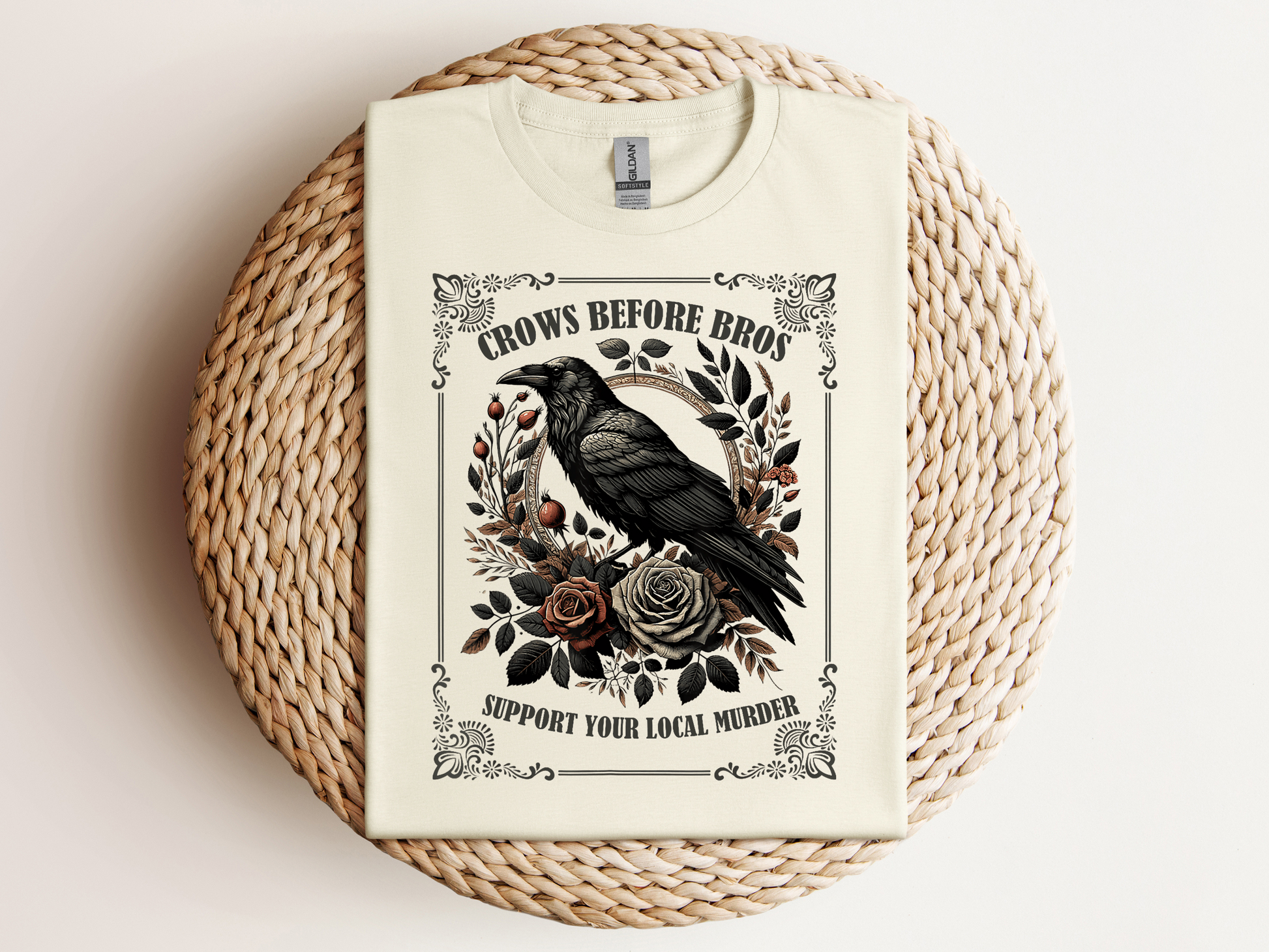 🖤 For the crow lovers and dark humor fans — the Crows Before Bros Tee is here. Featuring a bold black crow surrounded by roses and foliage, with the cheeky phrase “Support Your Local Murder”, this tee is perfect for spooky season or year-round gothic vibes.