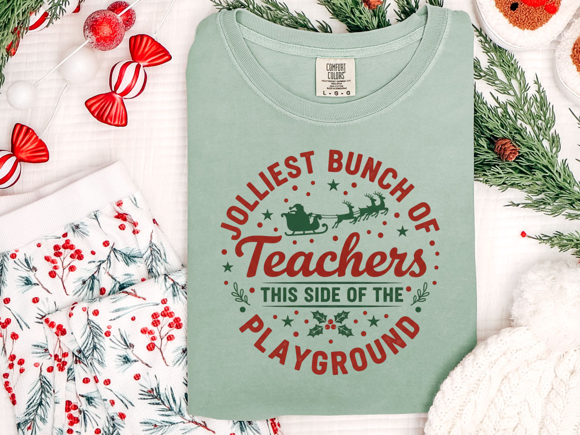 This Jolliest Bunch of Teachers This Side of the Playground tee is the perfect blend of holiday spirit and classroom sass. Featuring festive red and green lettering on a soft Comfort Colors tee, itβs comfy enough for classroom chaos and cute enough for Christmas parties.