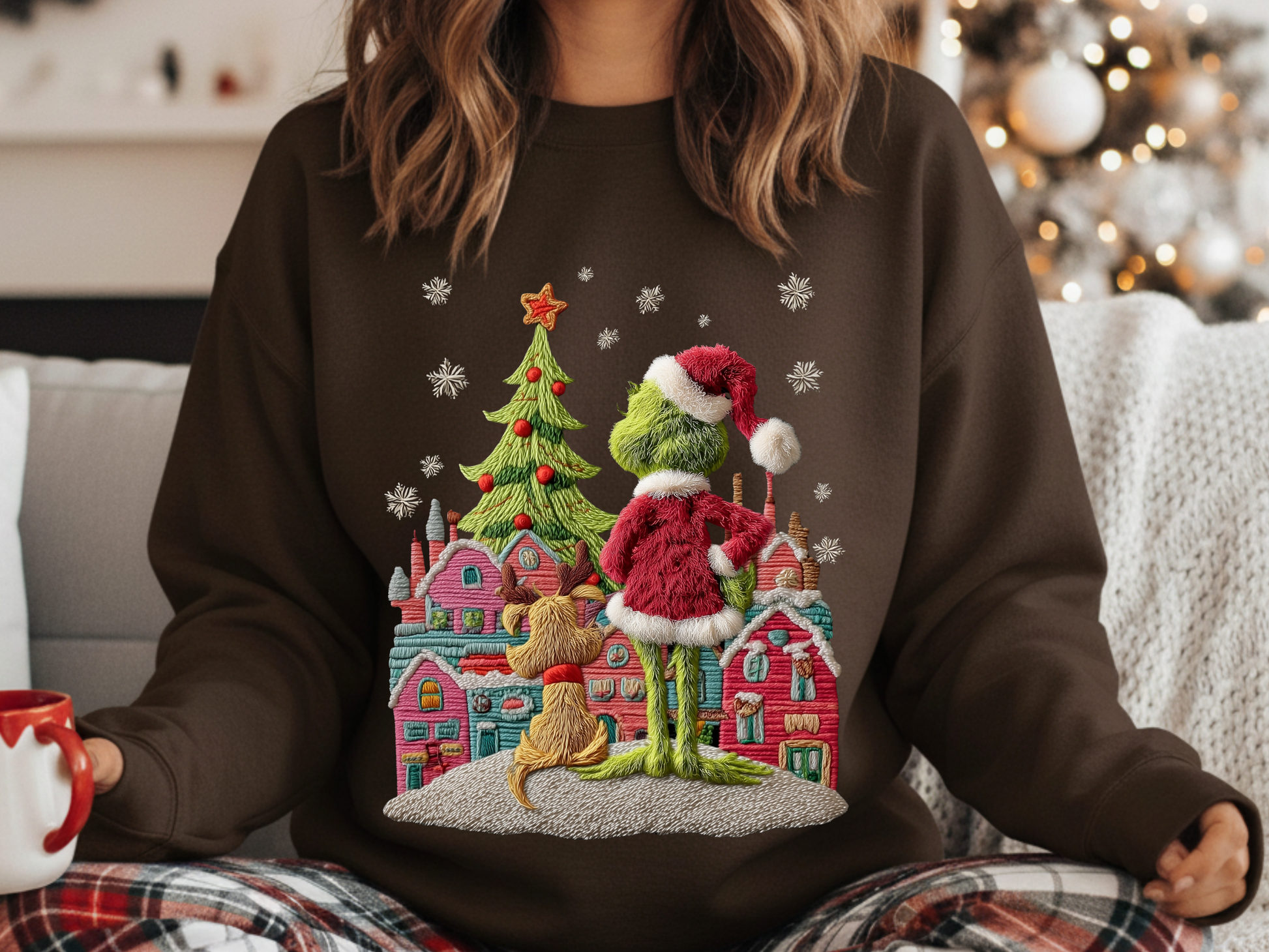 This Whoville Christmas Crewneck brings holiday magic (and a little sass) to your wardrobe. Featuring a vibrant, textured design inspired by everyone’s favorite grumpy green guy and his loyal pup, it’s the perfect pick for tree-trimming, cocoa-sipping, and spreading cheer — even if your heart’s two sizes too small 😉